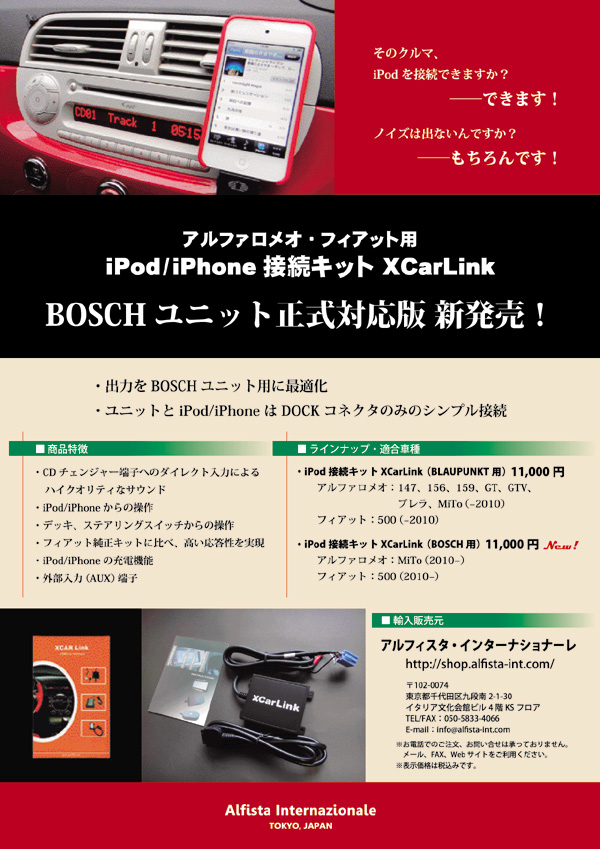先月発売いたしました 「iPod接続キット XCarLink」のBOSCHユニット正式対応版、 おかげさまで大好評をいただいております。 出力をBOSCHユニット用に最適化しているため ノイズも発生せず、クリアなサウンドをお楽しみいただけます。 iPod、iPhoneとはDOCKコネクターを繋ぐだけのシンプルな接続。 ステアリングスイッチからコントロールができるため 走行中の操作性も抜群です。 XCarLinkのリーフレットを 全国のアルファロメオ・フィアットディーラーにお送りしております。 自分で取り付けるのはちょっと・・・という方は、 ディーラーにご相談ください。 (クリックで拡大します) XCarLinkはBLAUPUNKT用、BOSCH用の2種類をご用意しております。 お申込みされる前に、必ずお車についているオーディオのメーカーをご確認ください。 ご購入はこちらからどうぞ!